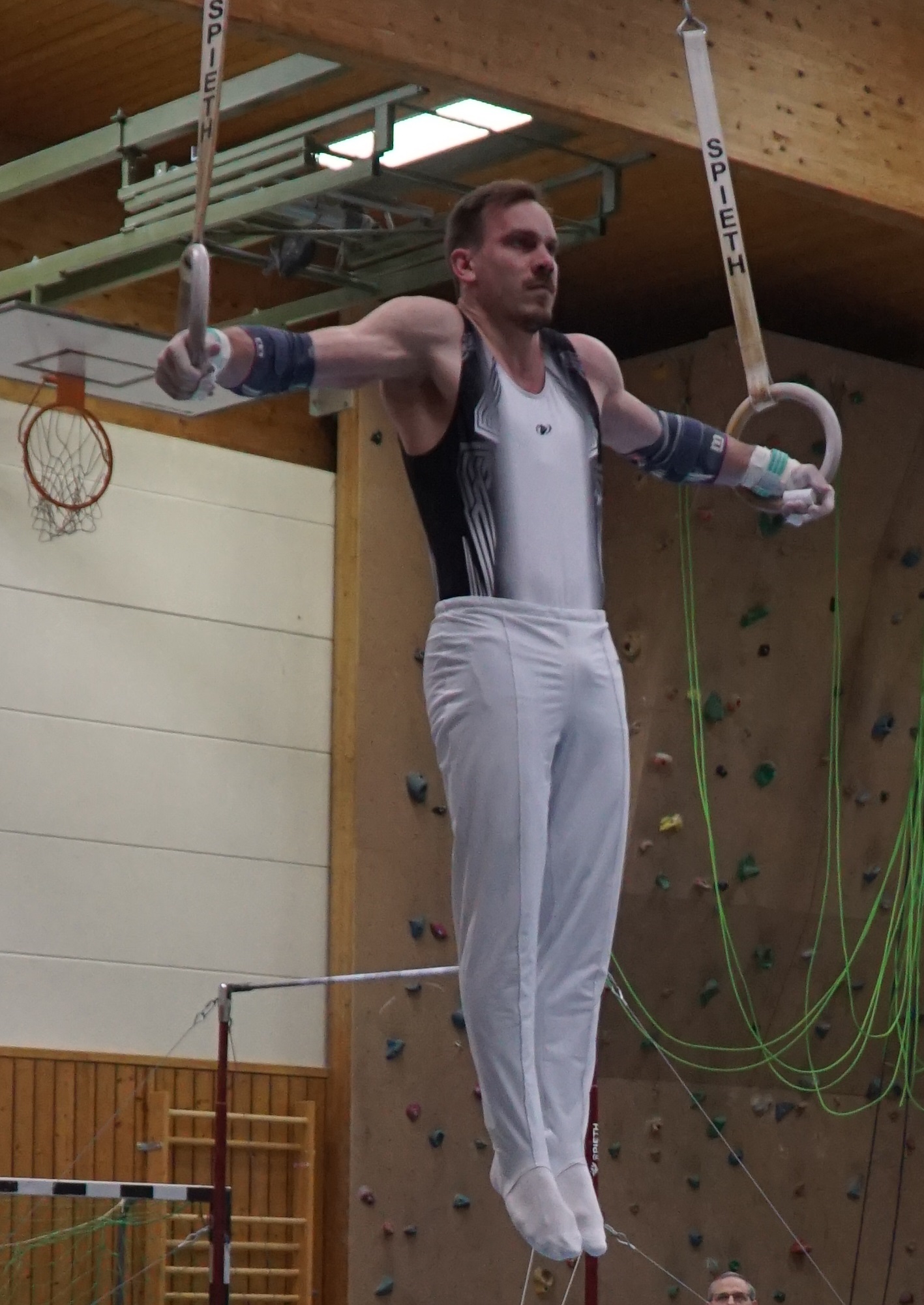 Am dritten Gerät, den Ringen, lagen die Wertungen der beiden Mannschaften eng beieinander und die Hettinger Mannschaft verlor dieses Gerät knapp mit 0,5 Punkten. Wiederum Pascal Briem (11P), Tobias Schmelcher (10,65P), Sebastian Wiese (10,65P) und David Dittrich (10,6P) zeigten den Zuschauern saubere Schwungelementen, Krafthalteteile mit gestrecktem Salto in den Stand.